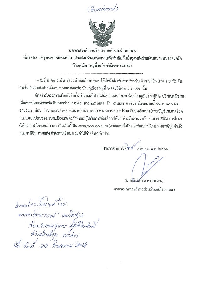 ประกาศผู้ชนะเสนอราคาจ้างก่อสร้างโครงการเสริมคันดินกั้นน้ำจุดหลังฝ่ายเดิ่นสนามหนองตะคร้อบ้านคูเมือง หมู่ 2