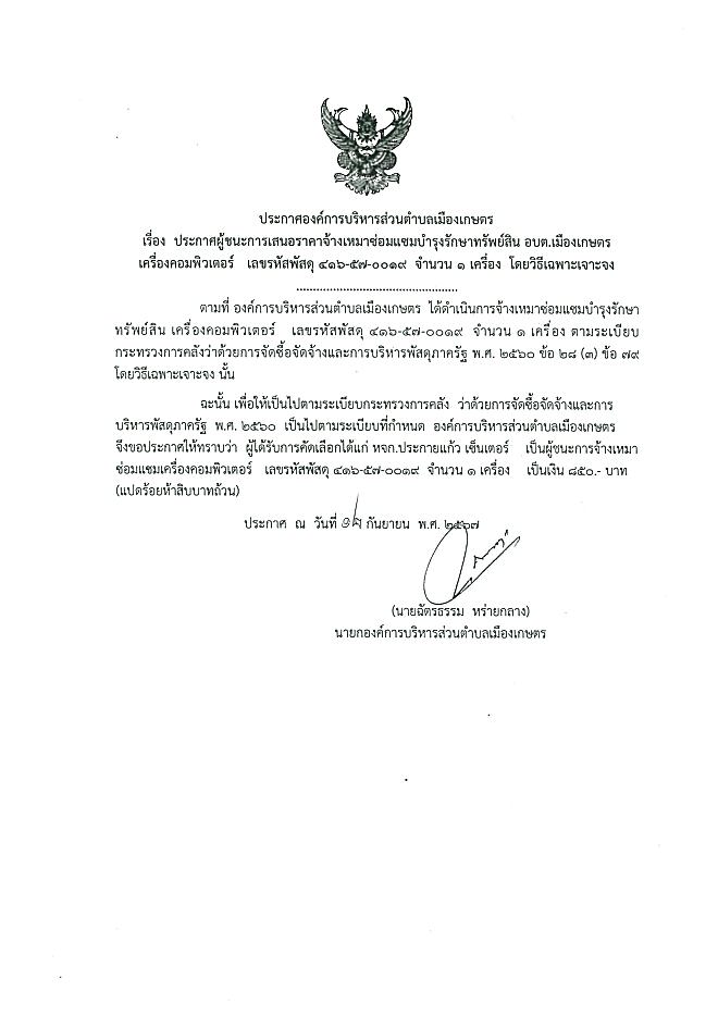ประกาศผู้ชนะเสนอราคาจ้างซ่อมแซ่มคอมพิวเตอร์ เลข416-57-0019 จำนวน 1 เครื่องโดยวิธีเฉพาะเจาะจง