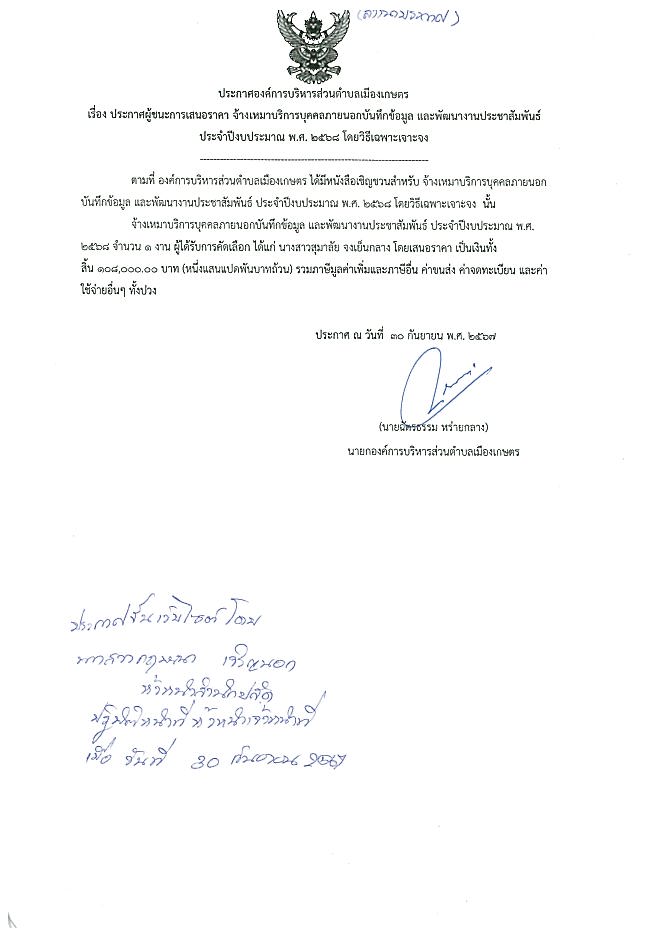 ประกาศผู้ชนะเสนอราคาจ้างเหมาบริการบุคคลภายนอกบันทึกข้อมูลและพัฒนางานประชาสัมพันธ์ โดยวิธีเฉพาะเจาะจง