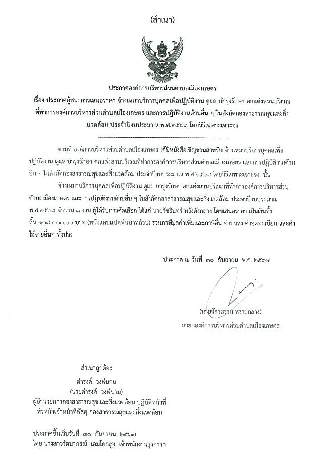 ประกาศผู้ชนะเสนอราคจ้างเหมาบริการบุคคลปฏิบัติงานดูแลบำรุงรักษาตกแต่งสวนบริเวณอบต.เมืองเกษตร ดดยวิธีเฉพาะเจาะจง