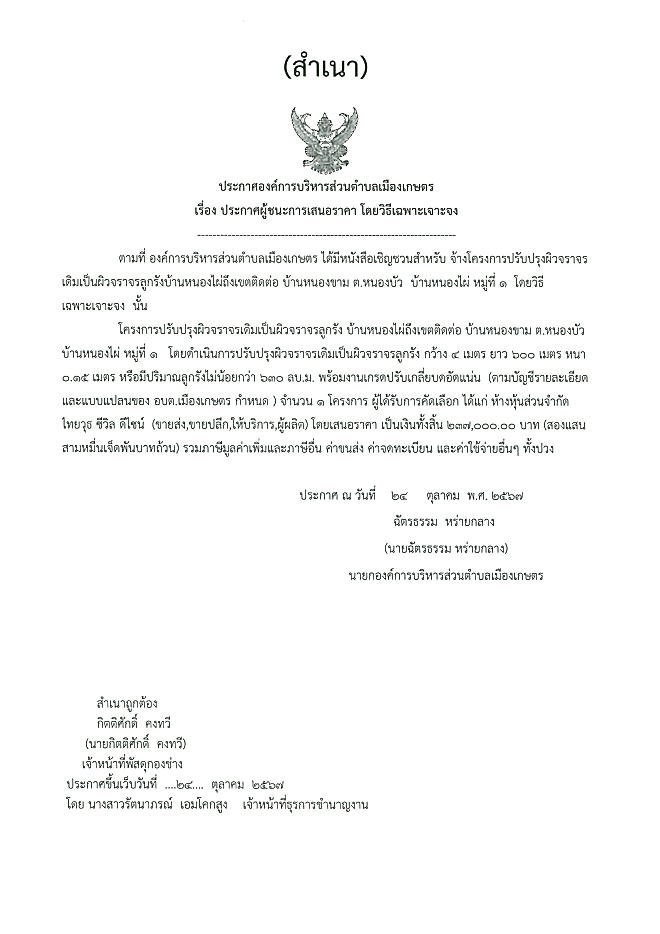 ประกาศผู้ชนะการเสนอราคา โดยเฉพาะเจาะจง