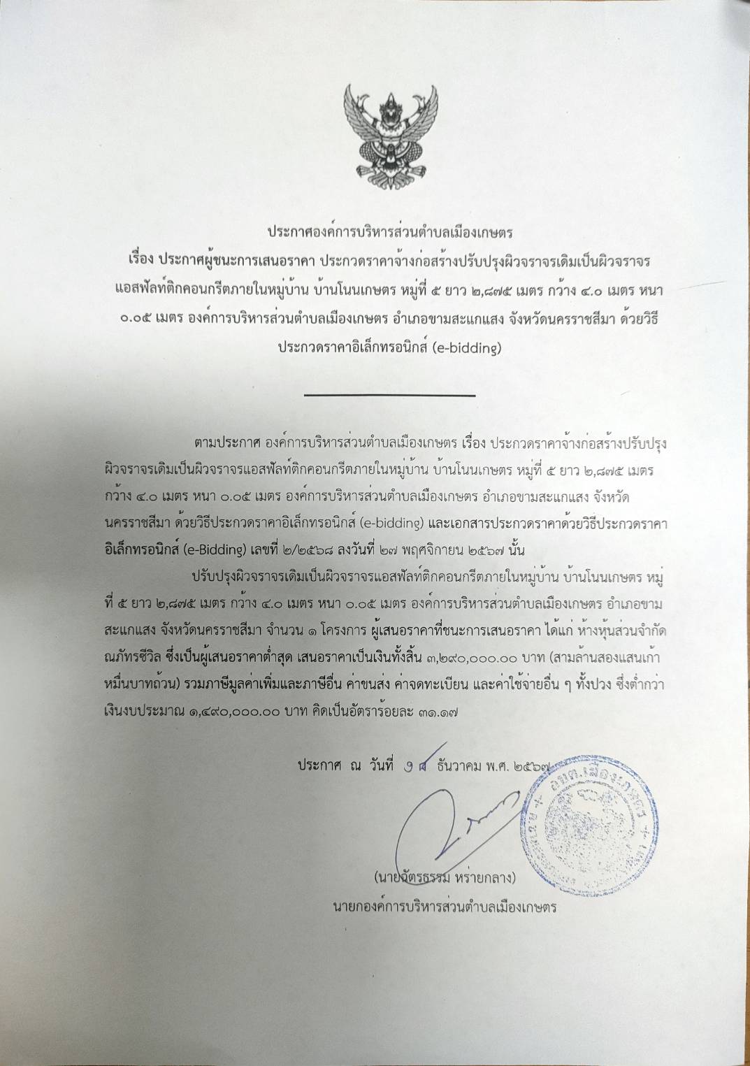 ประกาศผู้ชนะการแสนอราคาประกวดราคาจ้างก่อสร้างปรับปรุงผิวจราจรเดิมเป็นผิวจราจรแอสฟัลท์ติกคอนกรีตภายในหมู่บ้าน บ้านโนนเกษตร หมู่ที่ 5 ด้วยวิธีประกวดราคาอิเล็กทรอนิกส์