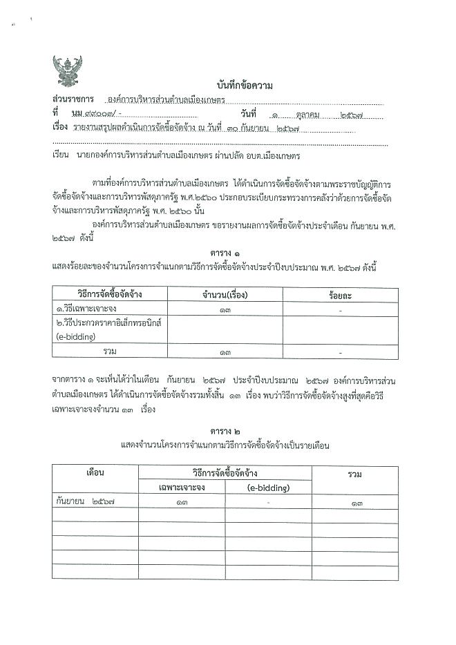 รายงานสรุปผลดำเนินการจัดซื้อจัดจ้างประจำเดือน กันยายน 2567
