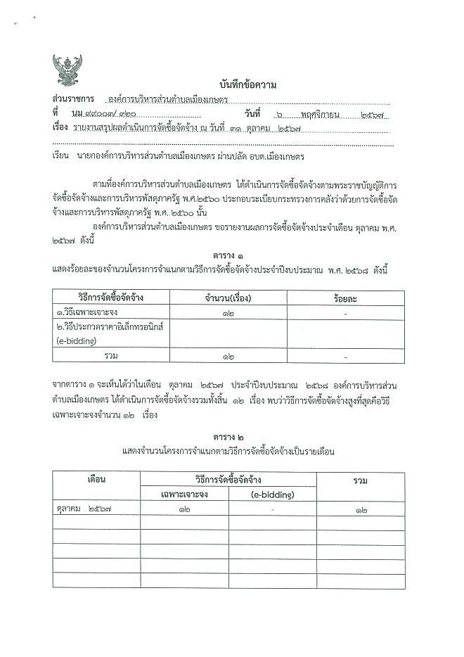 รายงานสรุปผลดำเนินการจัดซื้อจัดจ้างประจำเดือน ตุลาคม 2567
