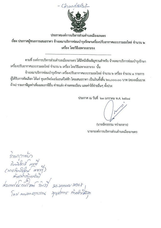 ประกาศผู้ชนะเสนอราคาจ้างเหมาซ่อมบำรุงรักษาเครื่องปรับอากาศแบบรวมอะไหล่ จำนวน 2 เครื่อง โดยวิธีเฉพาะเจาะจง