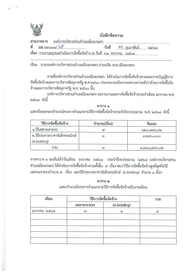 รายงานสรุปผลดำเนินการจัดซื้อจัดจ้าง ณ วันที่ 31 มกราคม 2568