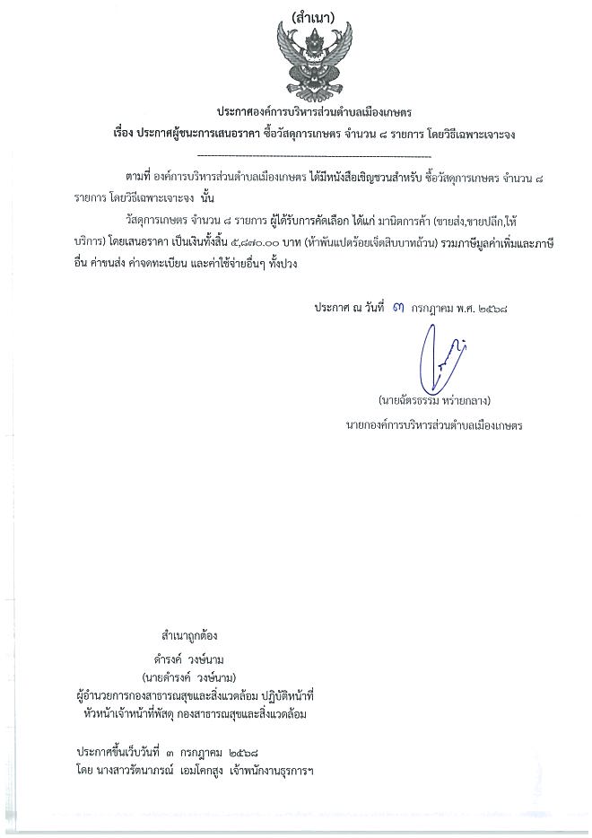 ประกาศผู้ชนะเสนอราคาซื้อวัสดุการเกษตร จำนวน 8 รายการ (กองสาธารณสุข)