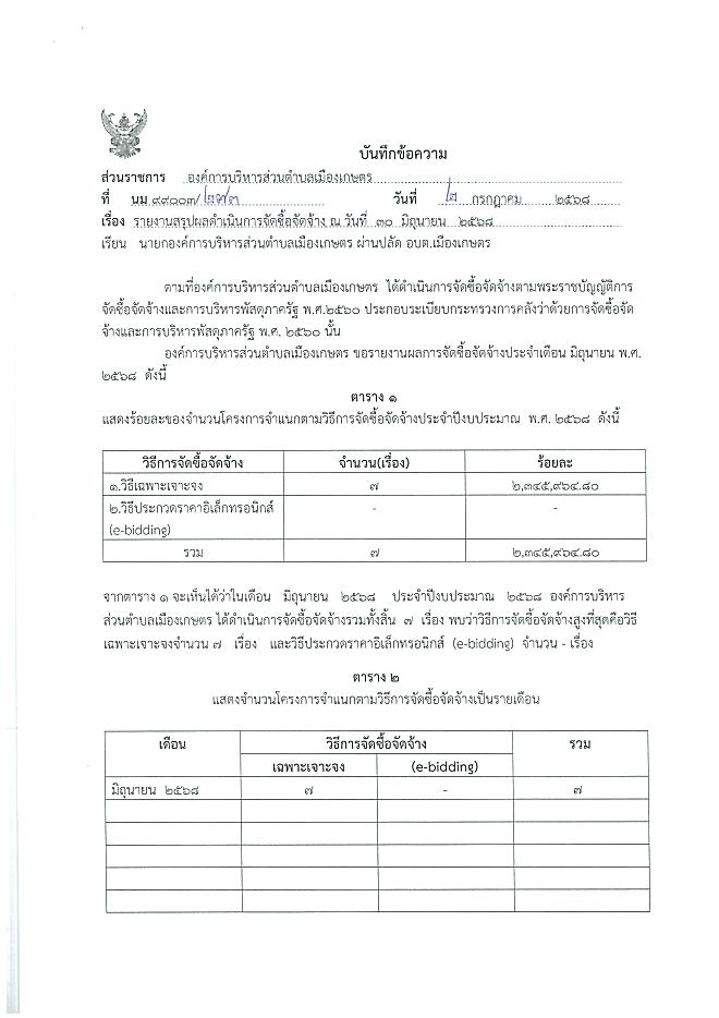 รายงานสรุปผลดำเนินการจัดซื้อจัดจ้าง ณ วันที่ 30 มิถุนายน 2568