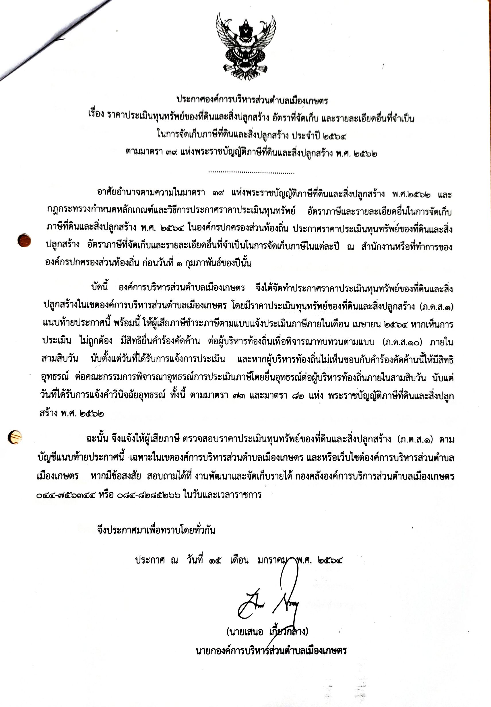 ราคาประเมินทุนทรัพย์ของที่ดินและสิ่งปลูกสร้าง อัตราที่จัดเก็บ และรายละเอียดอื่นที่จำเป็นในการจัดเก็บภาษีที่ดินและสิ่งปลูกสร้าง ประจำปี ๒๕๖๔ ตามมาตรา ๓๙ แห่งพระราชบัญญัติภาษีที่ดินและสิ่งปลูกสร้าง ๒๕๖๒
