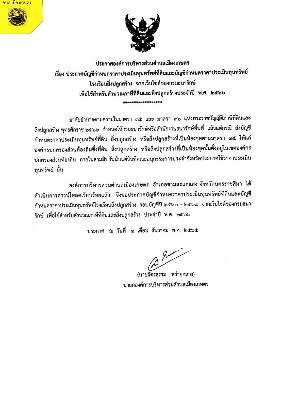 เรื่อง ประกาศบัญชีกำหนดราคาประเมินทุนทรัพย์ที่ดินและบัญชีกำหนดราคาประเมินทุนทรัพย์ โรงเรืองสิ่งปลูกสร้าง จากเว็บไซต์ของกรมธนารักษ์ เพื่อใช้สำหรับคำนวณภาษีที่ดินและสิ่งปลูกสร้างประจำปี พ.ศ.๒๕๖๖