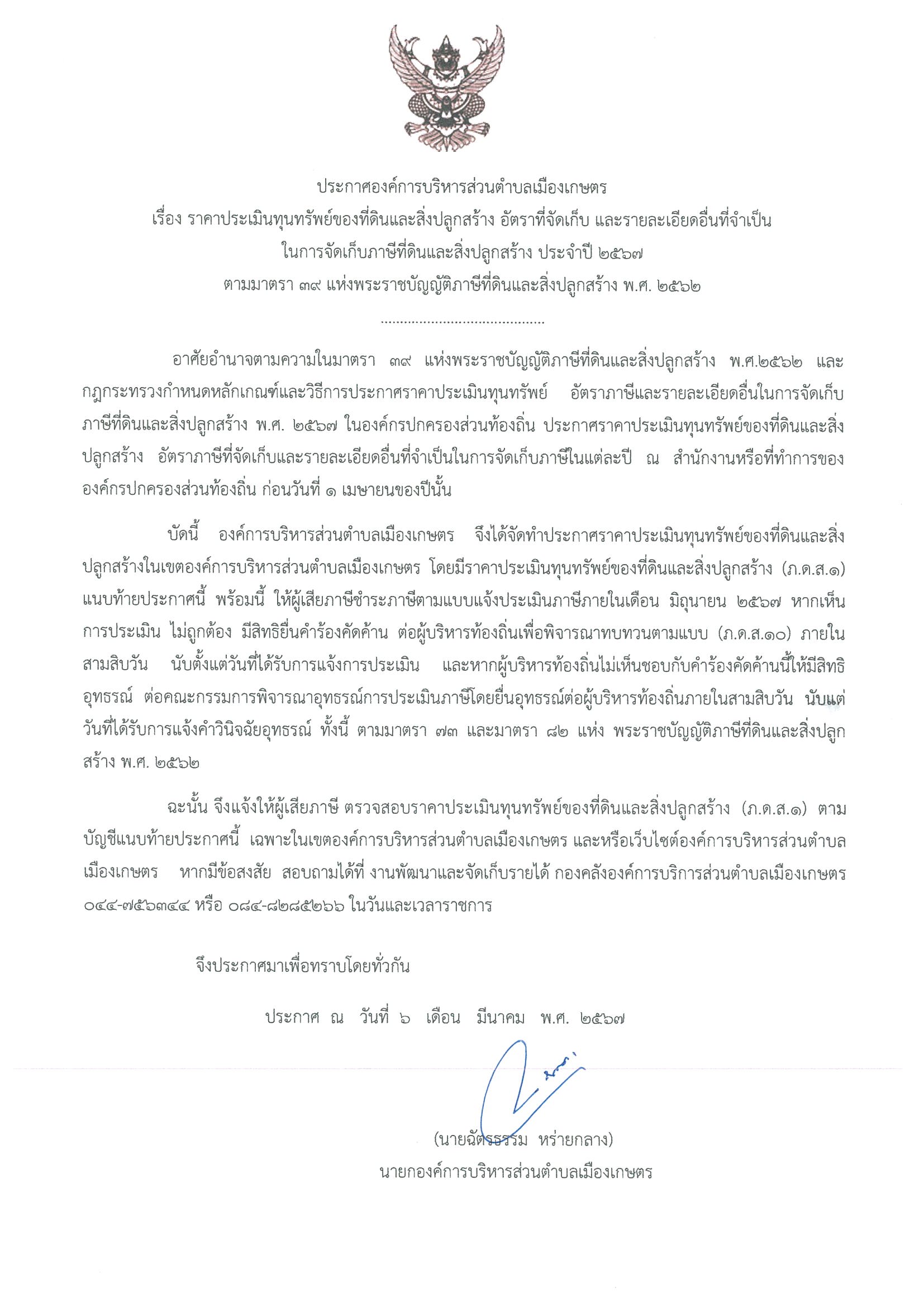 ราคาประเมินทุนทรัพย์ของที่ดินและสิ่งปลูกสร้าง อัตราที่จัดเก็บ ประจำปี 2567