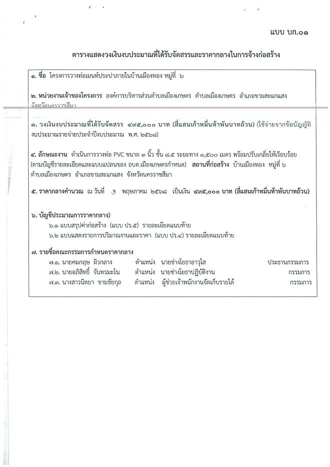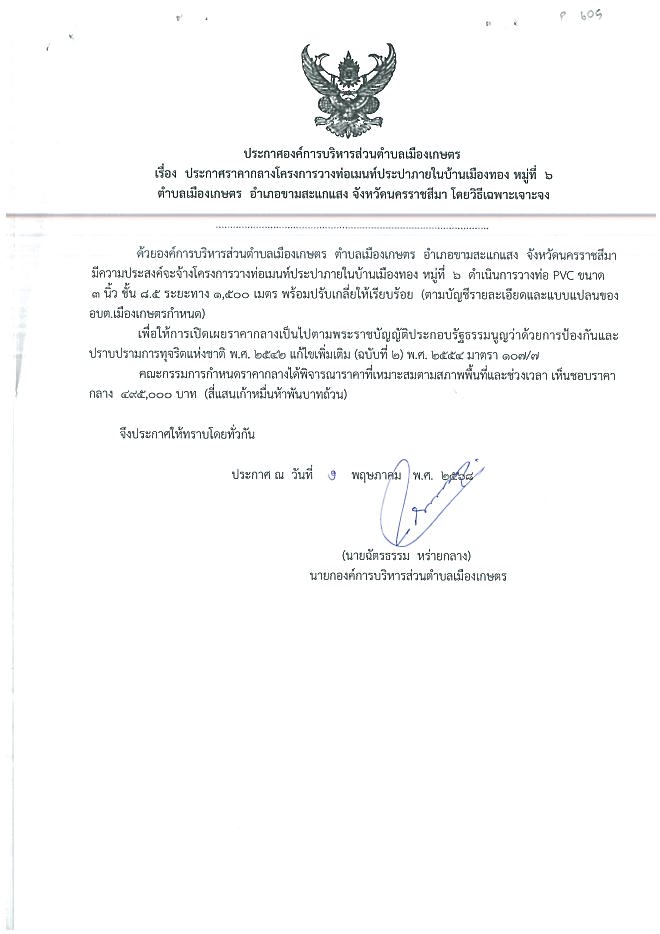 ประกาศราคากลางโครงการวางท่อเมนท์ประปาบ้านเมืองทอง ม.6