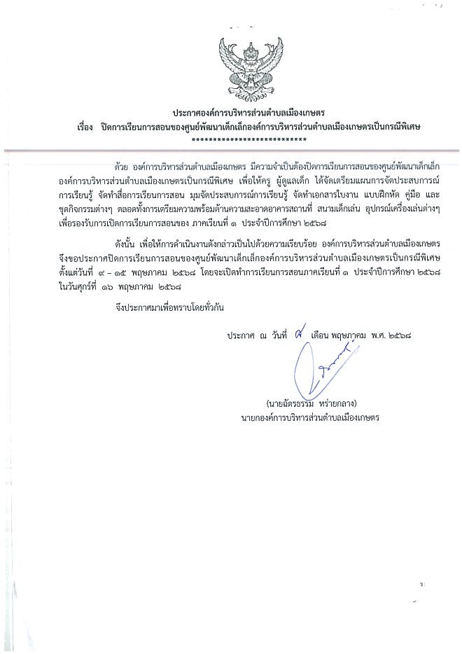 ประกาศปิดการเรียนการสอน ศพด.เมืองเกษตรเป็นกรณีพิเศษ