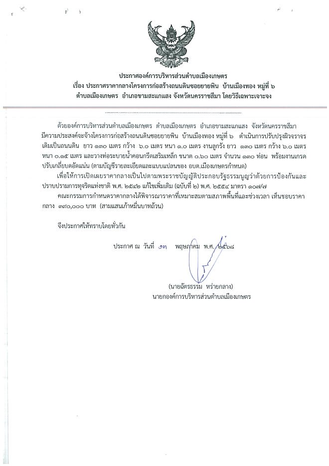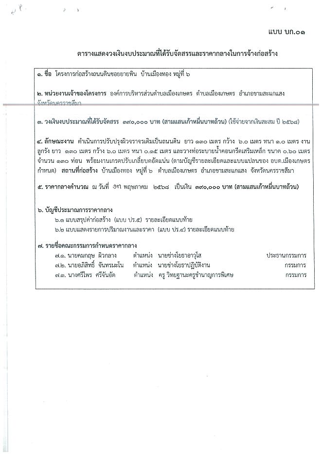 ประกาศราคากลางก่อสร้างถนนดินซอยยายพิน บ้านเมืองทอง