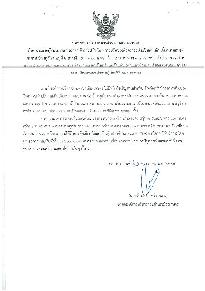 ประกาศผู้ชนะเสนอราคาโครงการปรับปรุงผิวจราจรเดิมเป็นถนนดินเดิ่นสนามหนองตะคร้อ ม.2