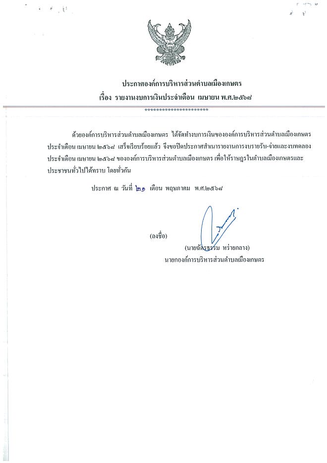 ประกาศรายงานงบการเงินประจำเดือน เมษายน 2568