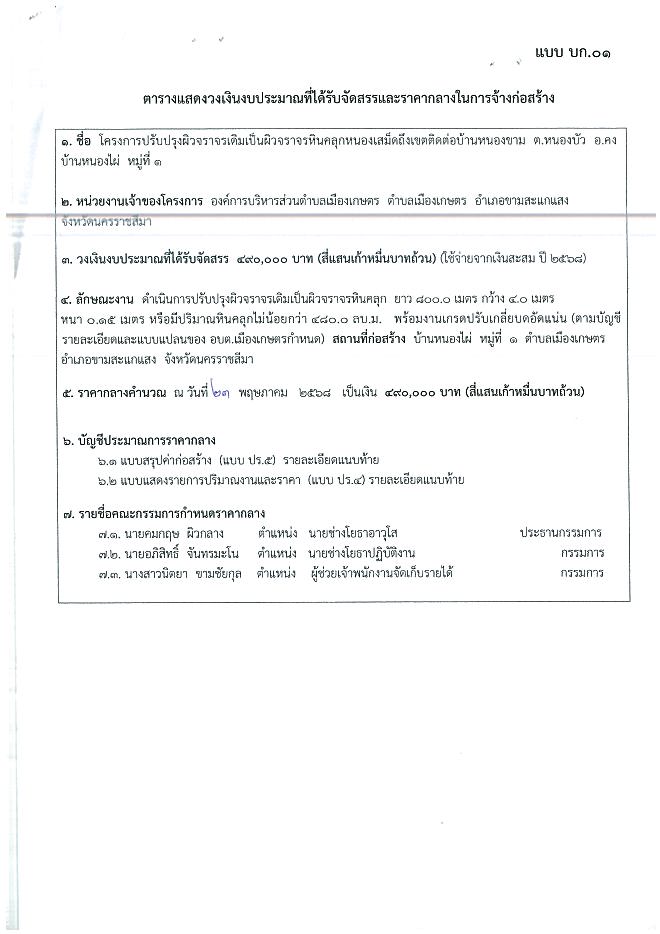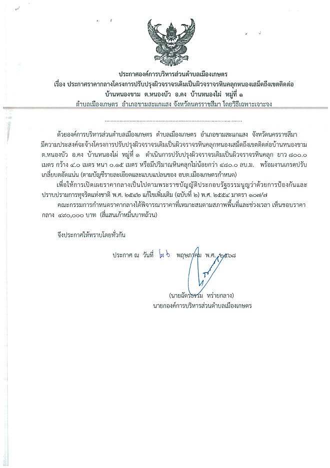 ประกาศราคากลางปรับปรุงผิวจราจรเดิมเป็นผวจราจรหินคลุกหนองเสม็ดถึงเขตติดต่อหนองขาม