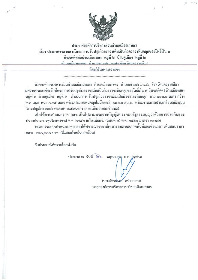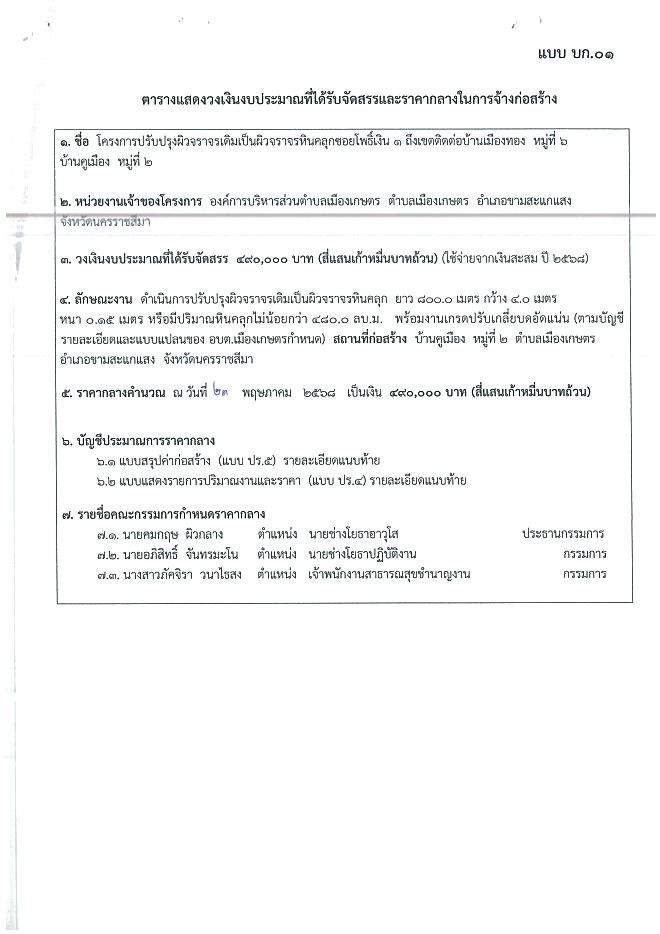 ประกาศราคากลางโครงการปรับปรุงผิวจราจรเดิมเป็นผิวจราจรหินคลุกซอยโพธิ์เงิน1
