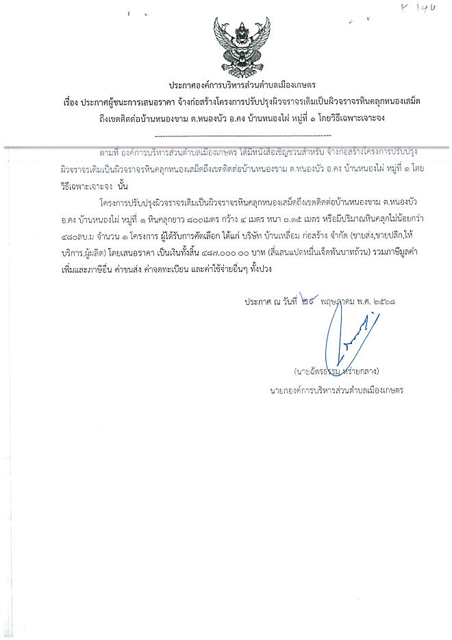 ประกาศผู้ชนะเสนอราคาก่อสร้างปรับปรุงผิวจราจรเดิมเป็นผิวจราจรหินคลุกหนองเสม็ด