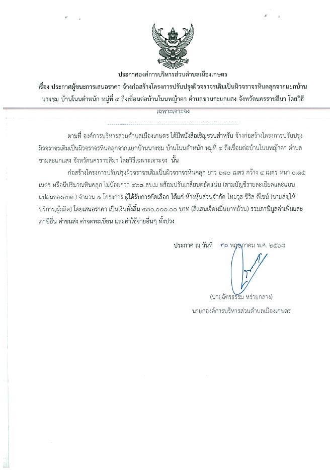 ประกาศผู้ชนะเสนอราคาปรับปรุงผิวจราจรเดิมเป็นผิวจราจรหินคลุกแยกบ้านนางชม ม.4