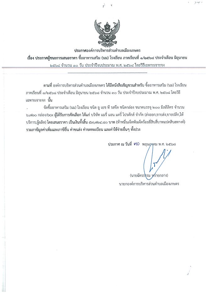 ประกาศผู้ชนะเสนอราคาซื้ออาหารเสริมนมโรงเรียน เดือน มื.ย.68 30 วัน