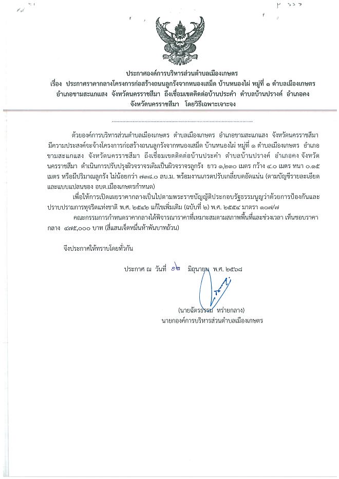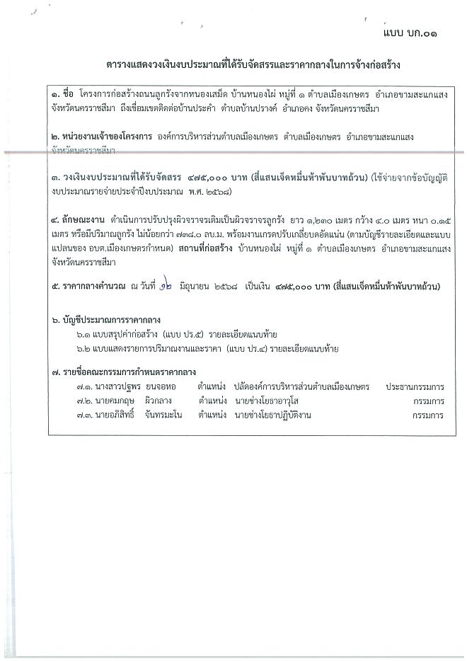 ประกาศราคากลางก่อสร้างถนนลูกรังหนองเสม็ดเชื่อมประคำบ้านปรางค์