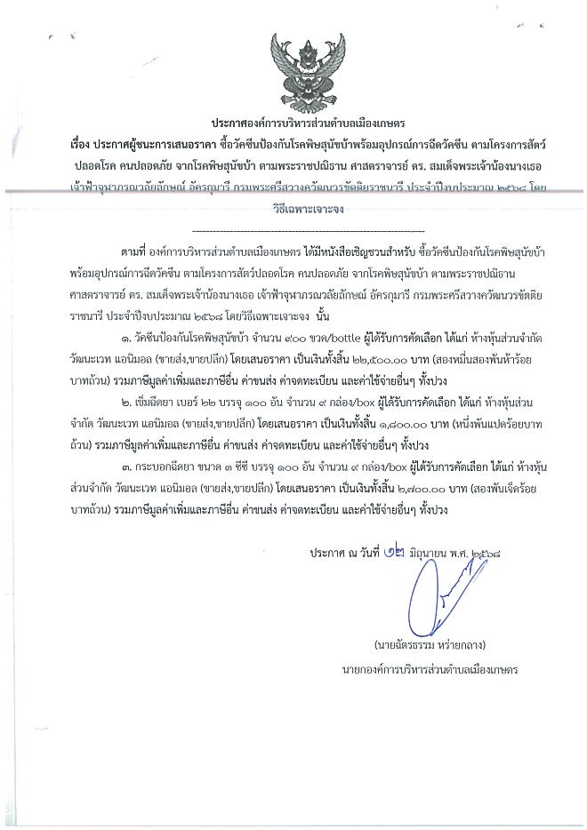 ประกาศผู้ชนะเสนอราคาซื้อวัคซีน (กองสาธาณสุขฯ)