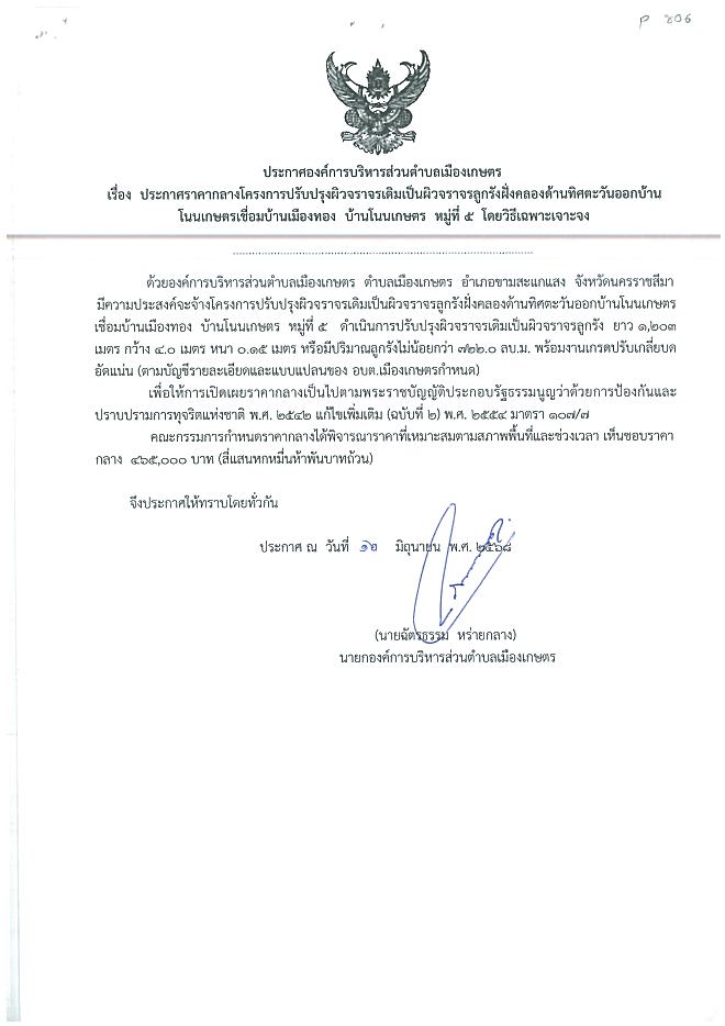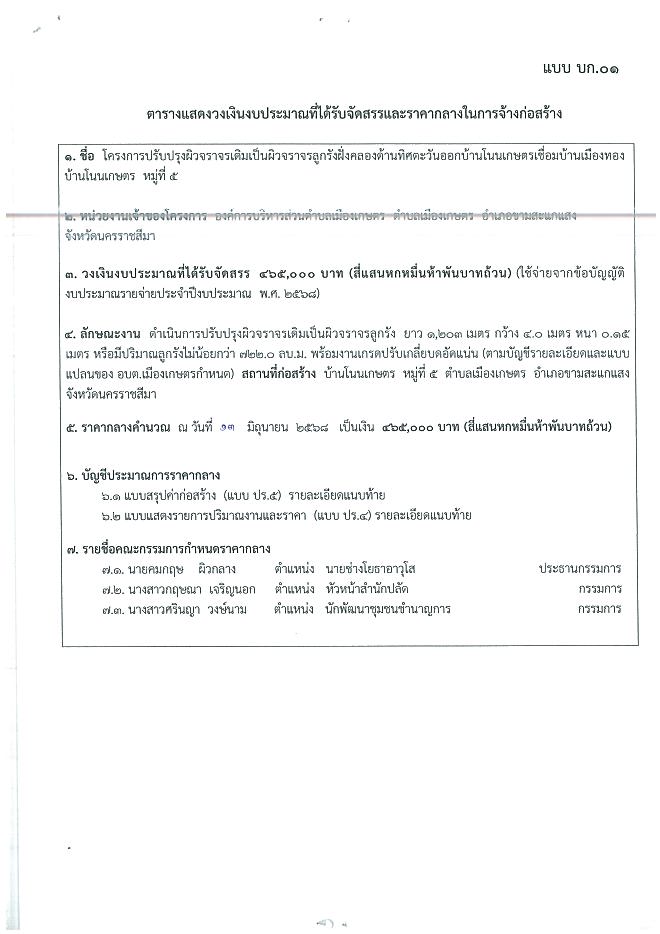 ประกาศราคากลางปรับปรุงผิวจราจรเดิมเป็นผิวจราจรลูกรังฝั่งคลองทิศตะวันออกโนนเกษตร