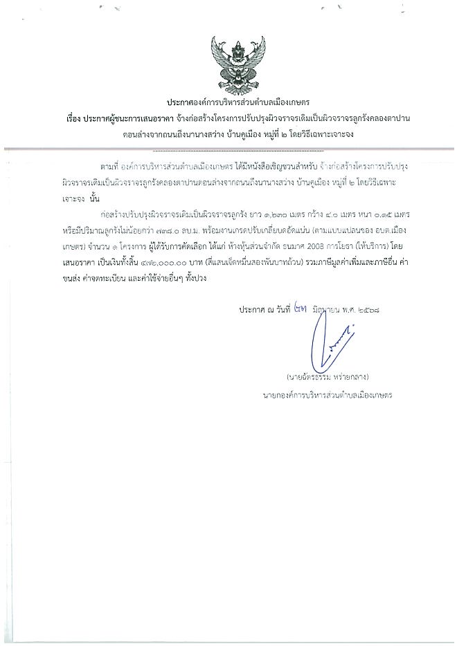 ประกาศผู้ชนะเสนอราคาจ้างปรับปรุงผิวจราจรเดิมเป็นผิวจราจรลูกรังคลองตาปานตอนล่าง
