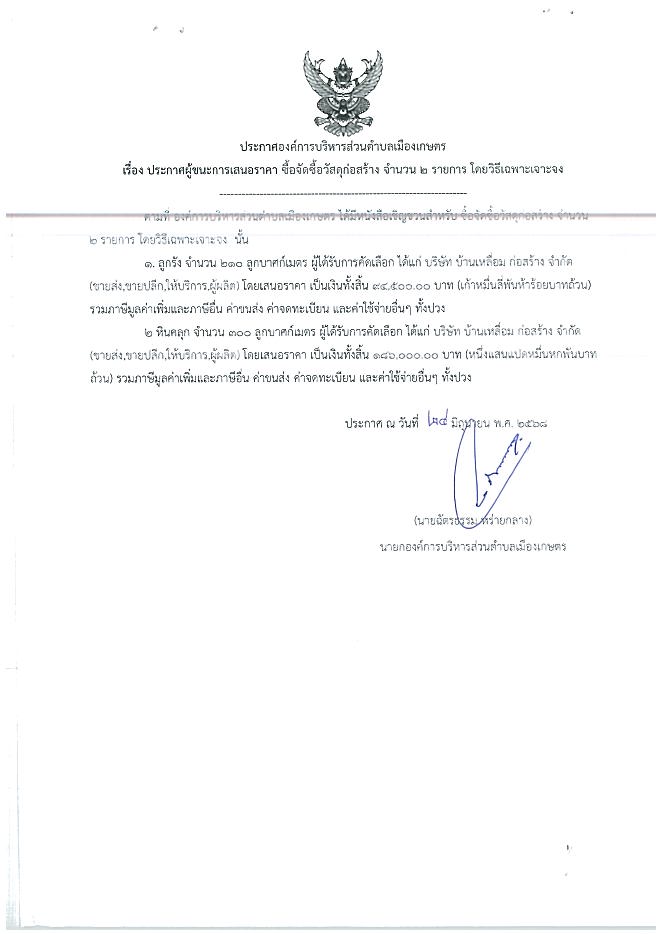 ประกาศผู้ชนะเสนอราคาซื้อวัสดุก่อสร้าง 2 รายการ