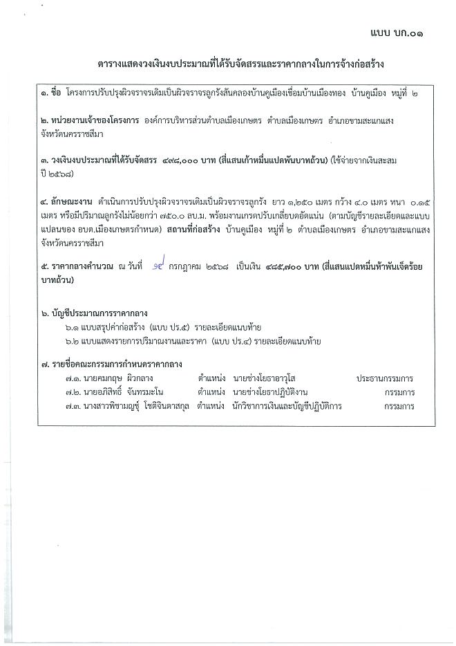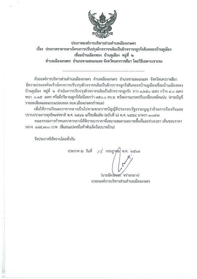 ประกาศราคากลางโครงการปรับปรุงผิวจราจรเดิมเป็นผิวจราจรลูกรังสันคลองบ้านคูเมืองเชื่อมบ้านเมืองทอง บ้านคูเมือง หมู่ที่ 2