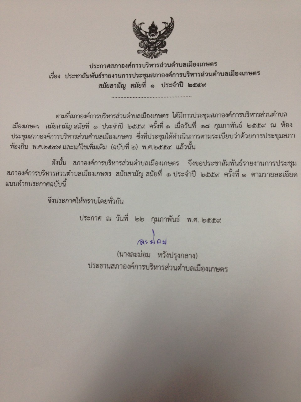 ประกาศประชาสัมพันธ์รายงานการประชุมสภา อบต.เมืองเกษตร สมัยที่ 1 ประจำปี 2559
