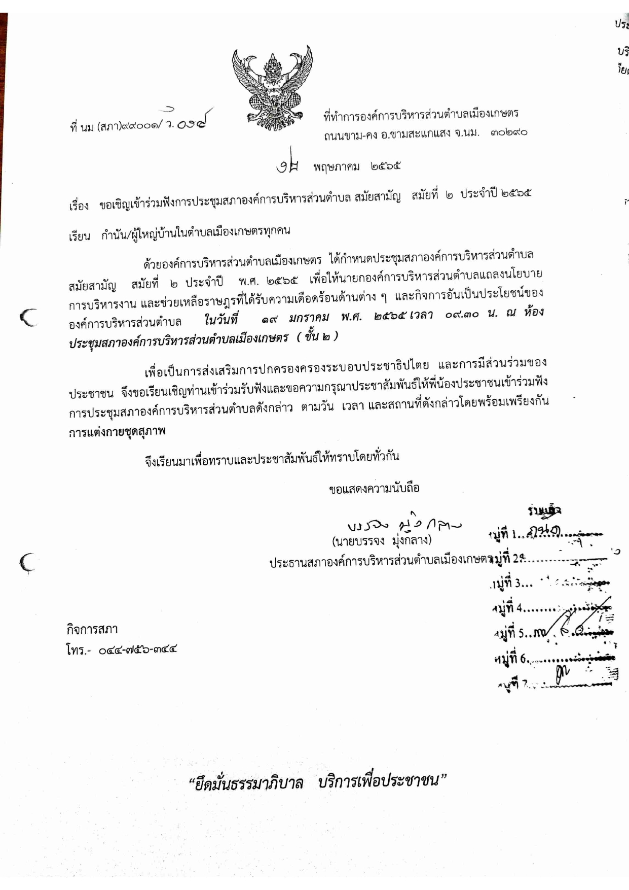 ประชาสัมพันธ์เชิญชวนเข้ารับฟังการประชุมสภา อบต.เมืองเกษตร สมัยสามัญที่ 2/2565