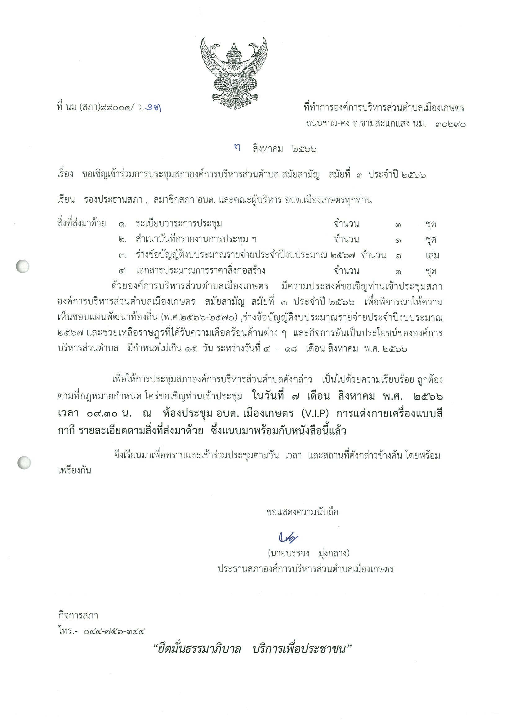 ขอเชิญเข้าร่วมประชุมสภาองค์การบริหารส่วนตำบล สมัยสามัญ สมัยที่3 ประจำปี 2566