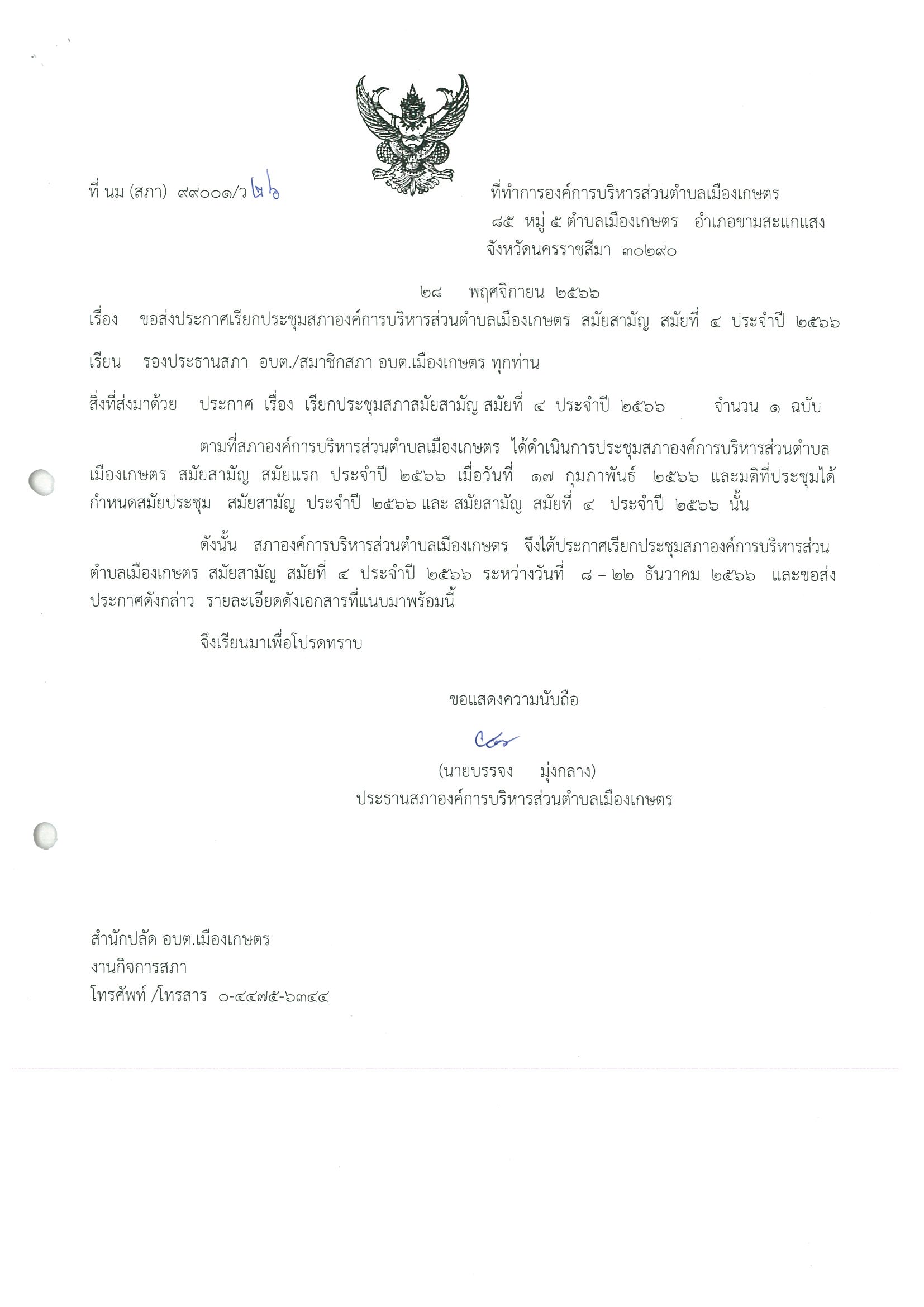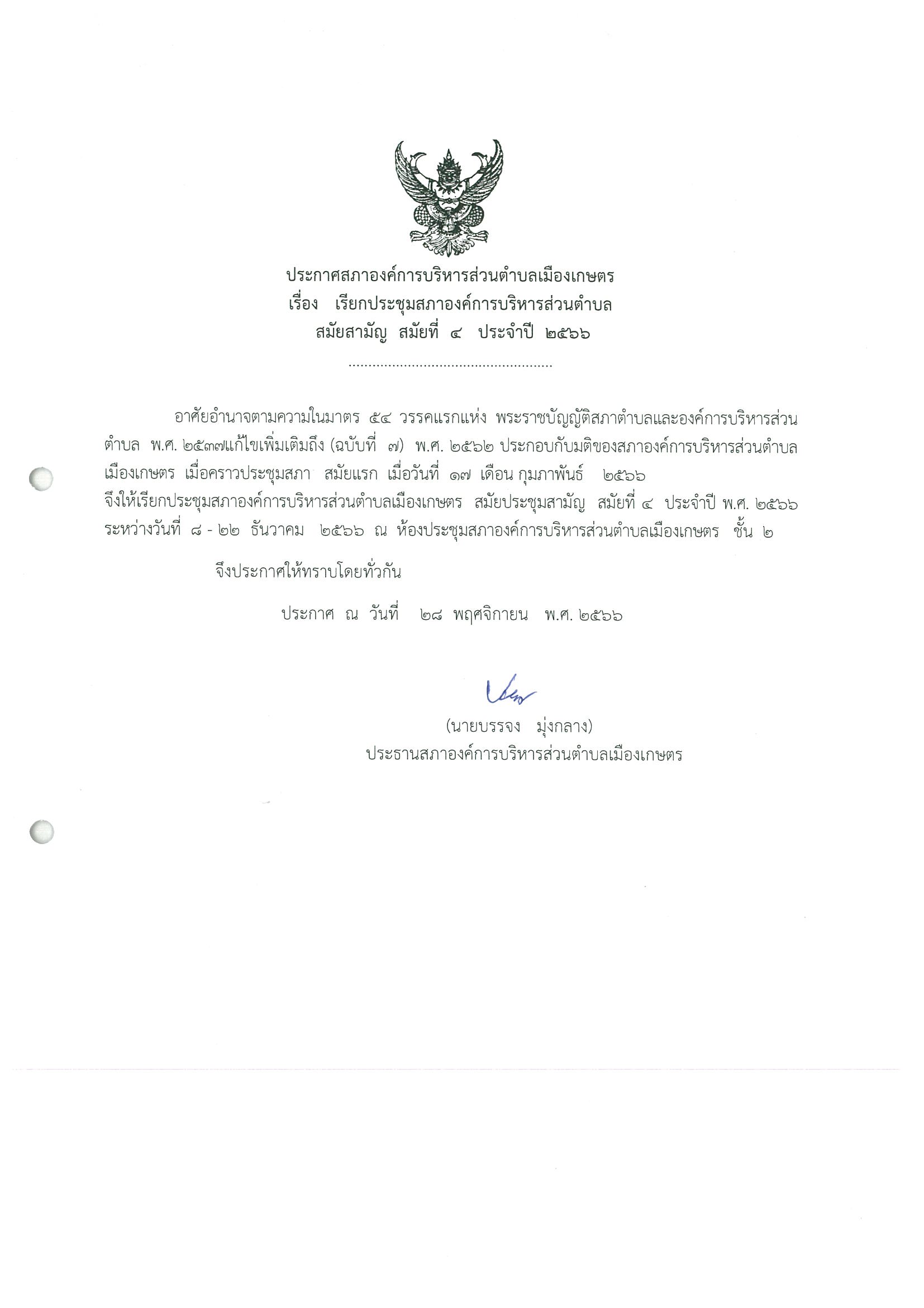 เรียกประชุมสภาองค์ฏารบริหารส่วนตำบล สมัยสามัญ สมัยที่ 4 ประจำปี 2566