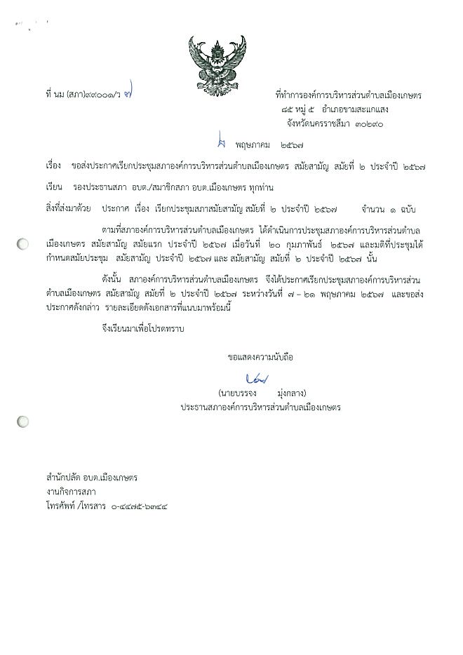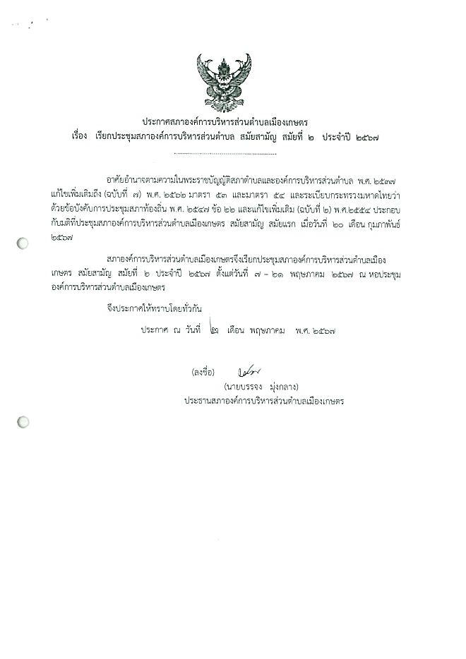 ประกาศเรียกประชุมสภาองค์การบริหารส่วนตำบลเมืองเกษตร