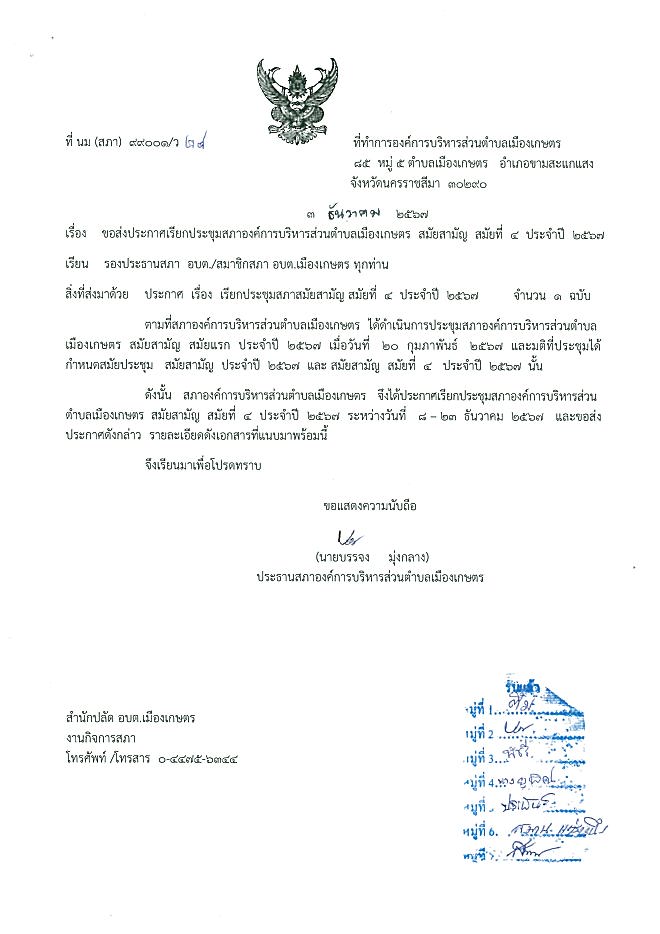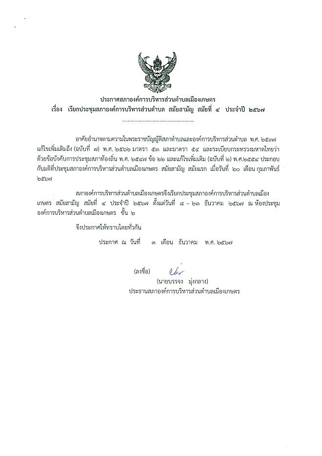 ขอส่งประกาศเรียกประชุมสภา อบต.เมืองเกษตร สมัยสามัญสมัยที่ 4 ปี 2567
