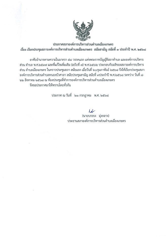 เรียกประชุมสภาอบต.เมืองเกษตร สมัยสามัญ สมัยที่ 3ประจำปี 2568