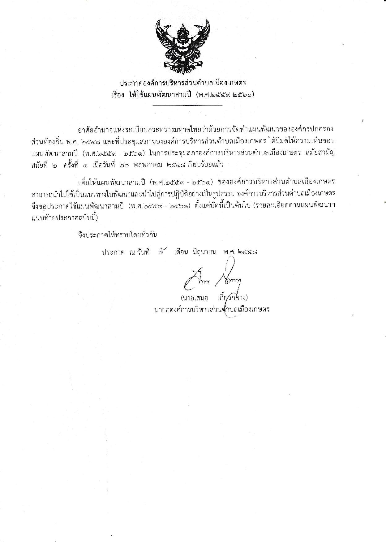 อบต.เมืองเกษตรได้ดำเนินการประกาศใช้แผนพัฒนาสามปี (พ.ศ.2559-2561) โดยผ่านความเห็นชอบของสภา อบต.เมืองเกษตร