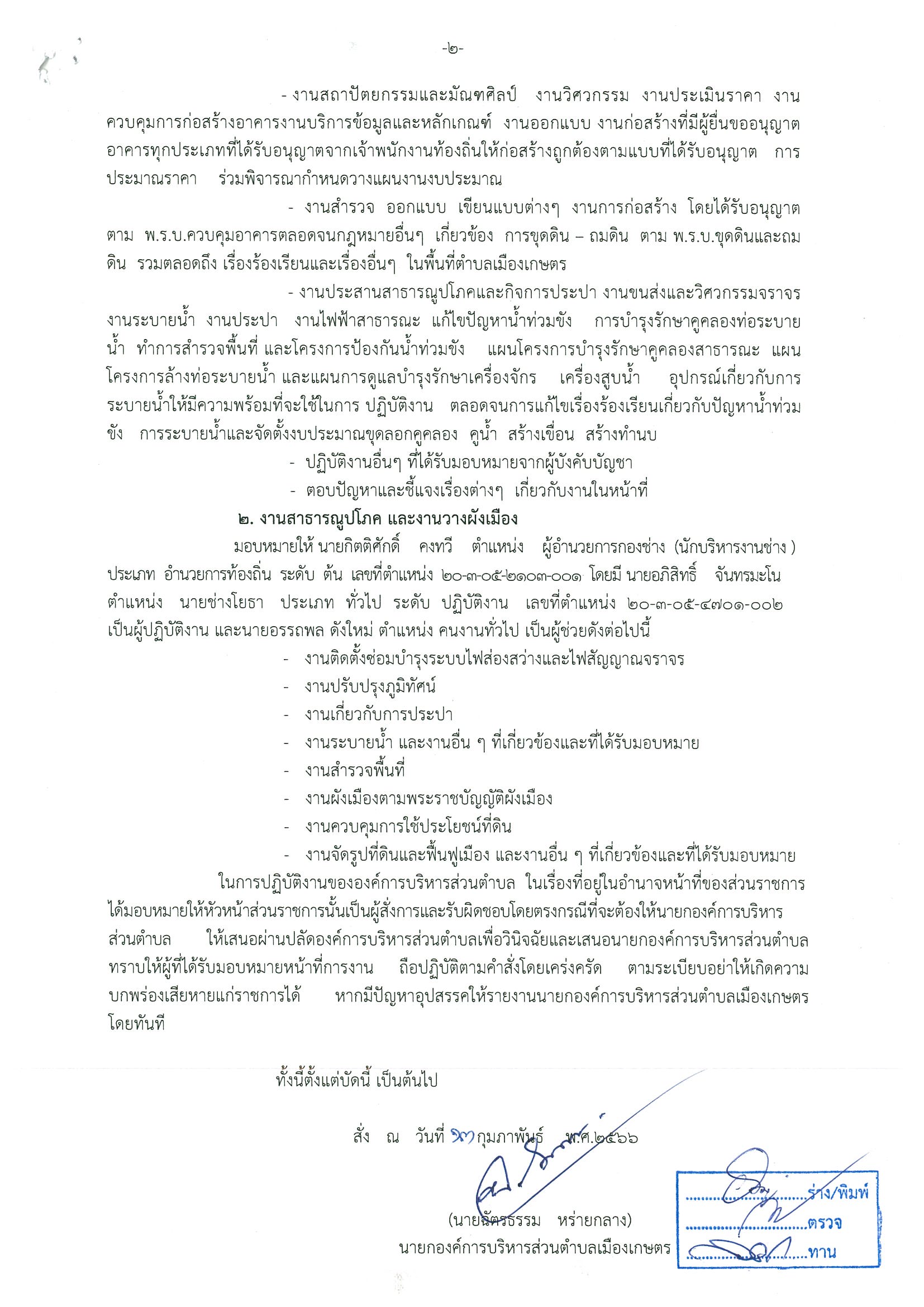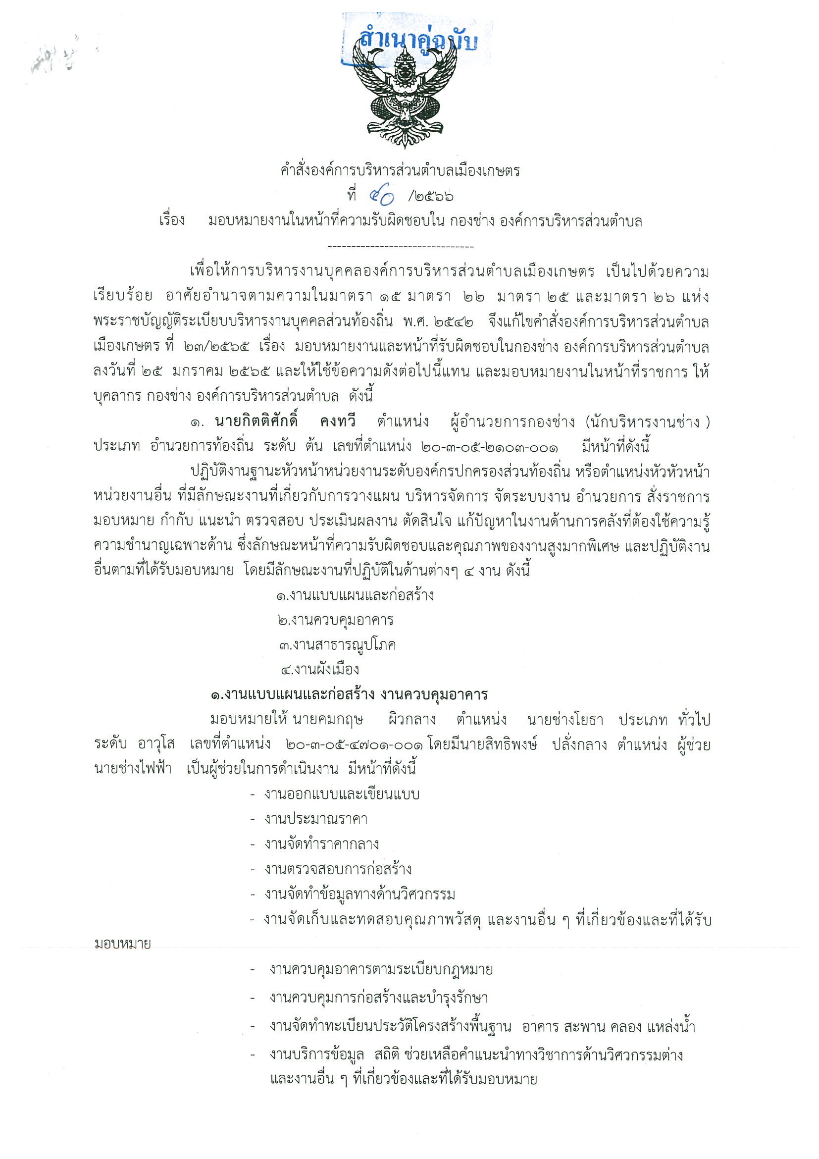 มอบหมายงานและหน้าที่ความรับผิดชอบใน กองช่าง องค์การบริหารส่วนตำบล