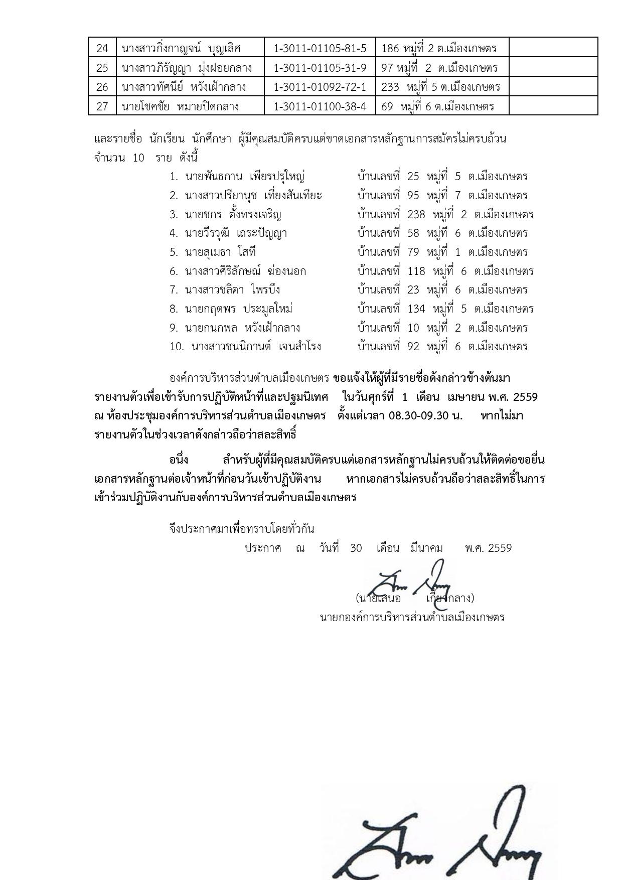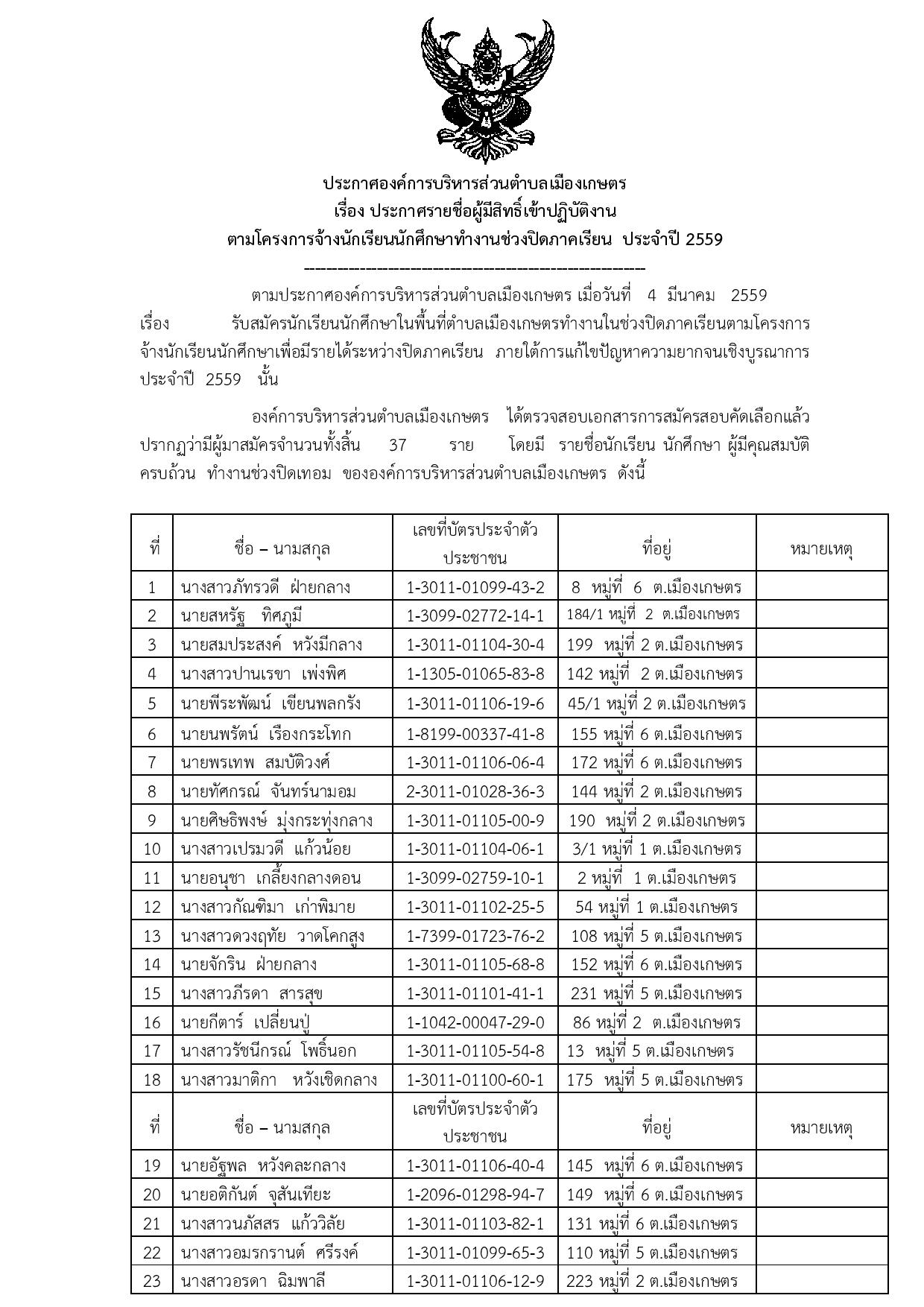 ประกาศรายชื่อผู้มีสิทธิ์เข้าปฏิบัติงาน ตามโครงการจ้างนักเรียนนักศึกษาทำงานช่วงปิดภาคเรียน ประจำปี 2559