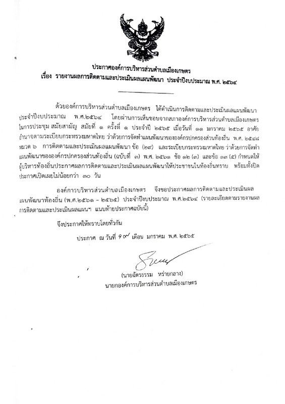 รายงานผลการติดตามและประเมินผลแผนพัฒนา ประจำปีงบประมาณ 2564
