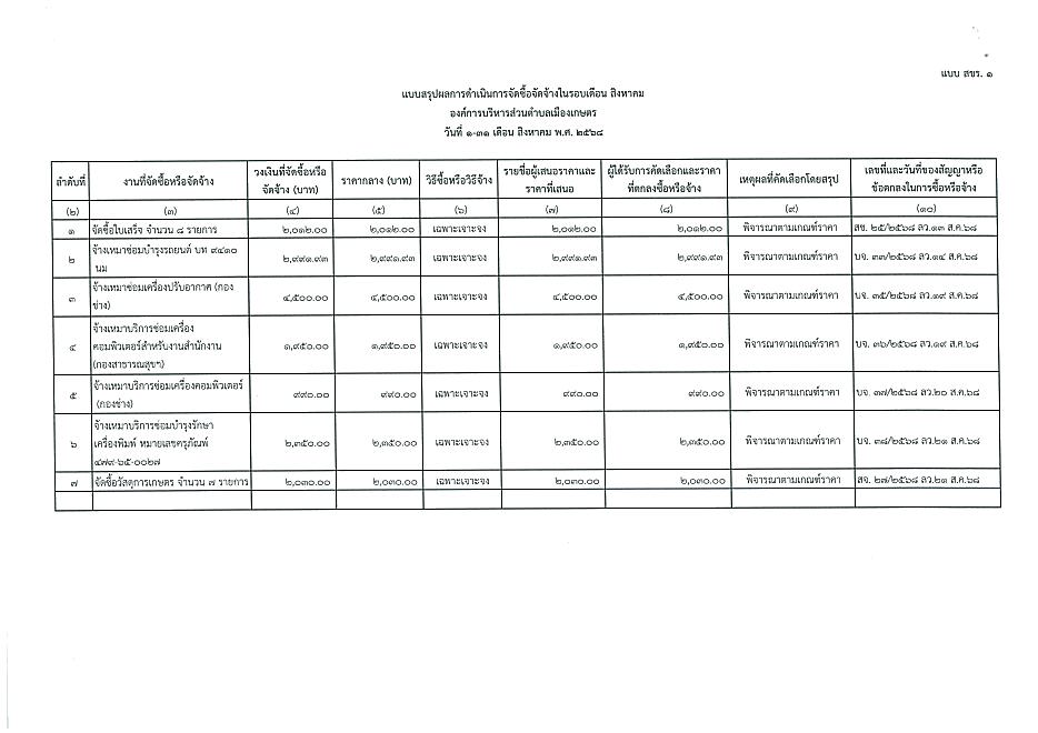 สรุปผลการจัดซื้อจัดจ้าง ประจำเดือน สิงหาคม พ.ศ. 2568