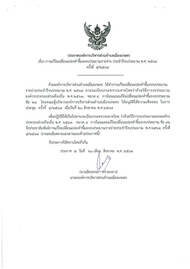 การแก้ไขเปลี่ยนแปลงคำชี้แจงงบประมาณรายจ่าย ประจำปีงบประมาณ 2568 ครี้งที่ 5