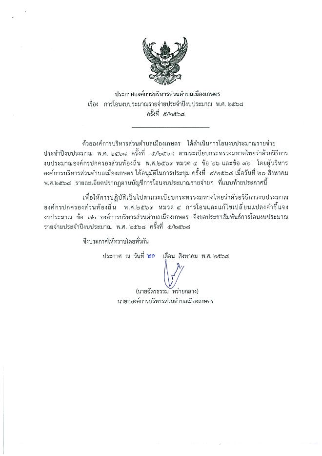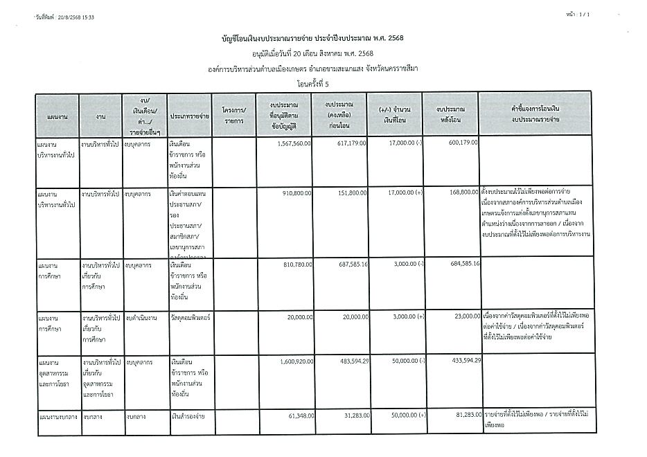 การโอนงบประมาณรายจ่ายประจำปีงบประมาณ พ.ศ.2568 ครั้งที่ 5/2568