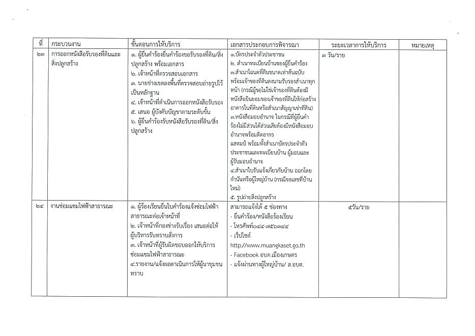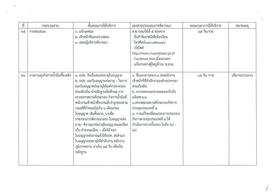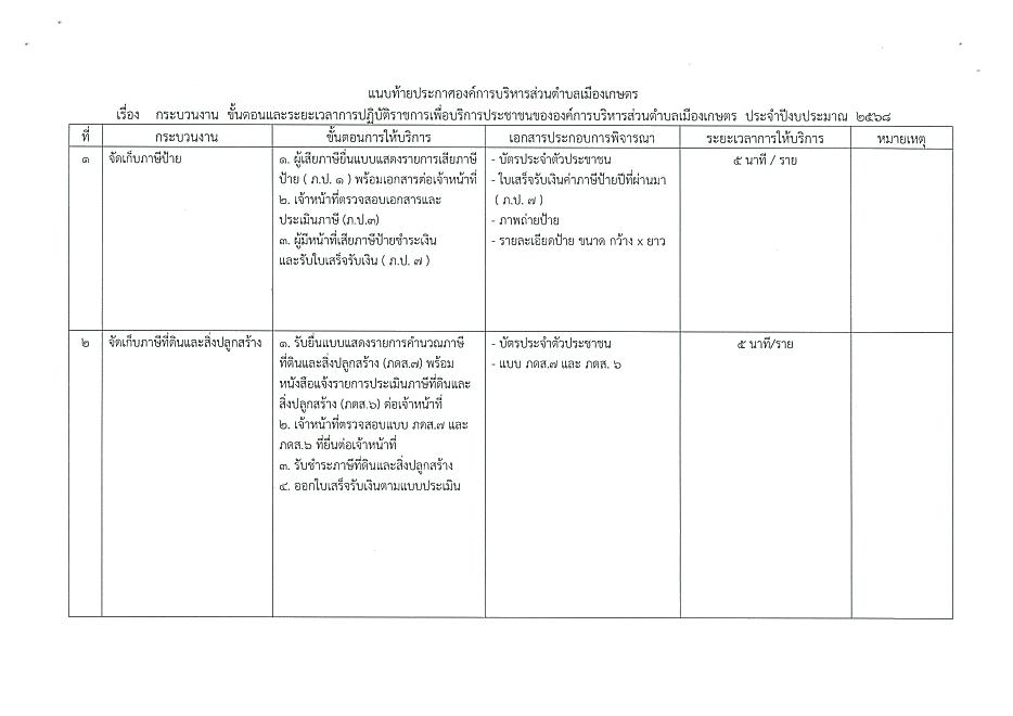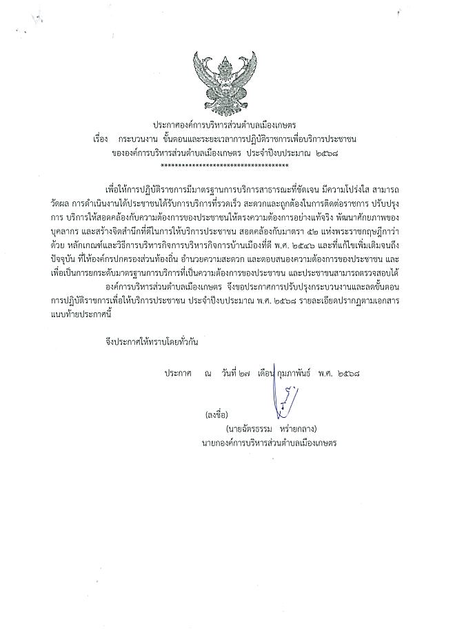 ประกาศกระบวนงาน ขั้นตอนและระยะเวลาการปฏิบัติราชการเพื่อบริการประชาชนขององค์การบริหารส่วนตำบลเมืองเกษตร ประจำปีงบประมาณ 2568