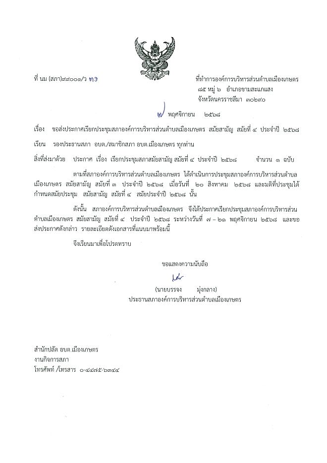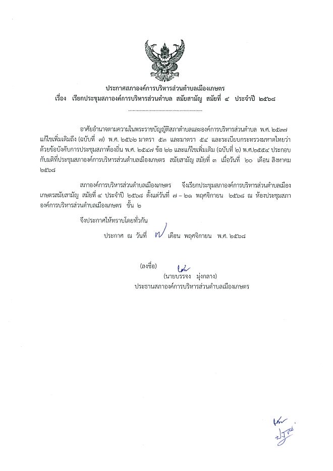 ประกาศเรียกประชุมสภาองค์การบริหารส่วนตำบลเมืองเกษตร สมัยสามัญ สมัยที่ 4 ประจำปี 2568