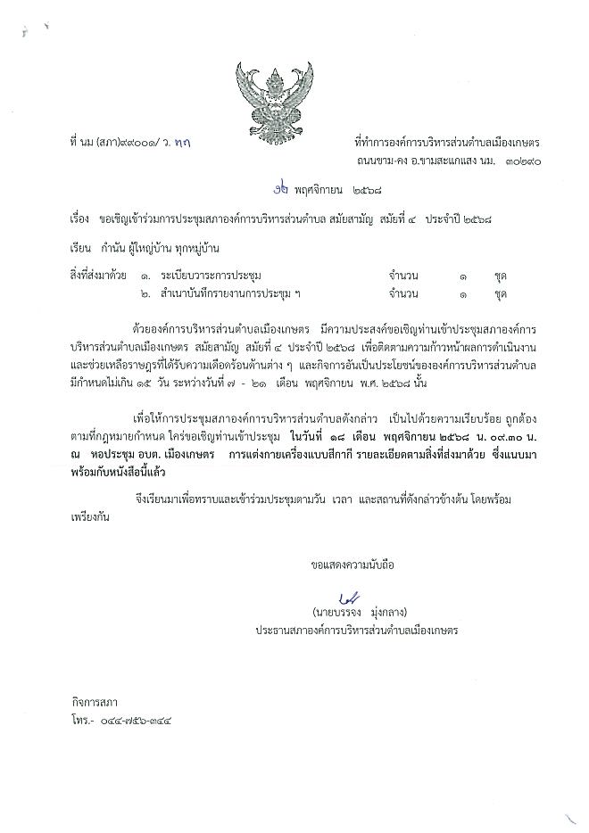 ขอเชิญเข้าร่วมการประชุมสภาองค์การบริหารส่วนตำบลเมืองเกษตร สมัยสามัญ สมัยที่ 4 ประจำปี 2568