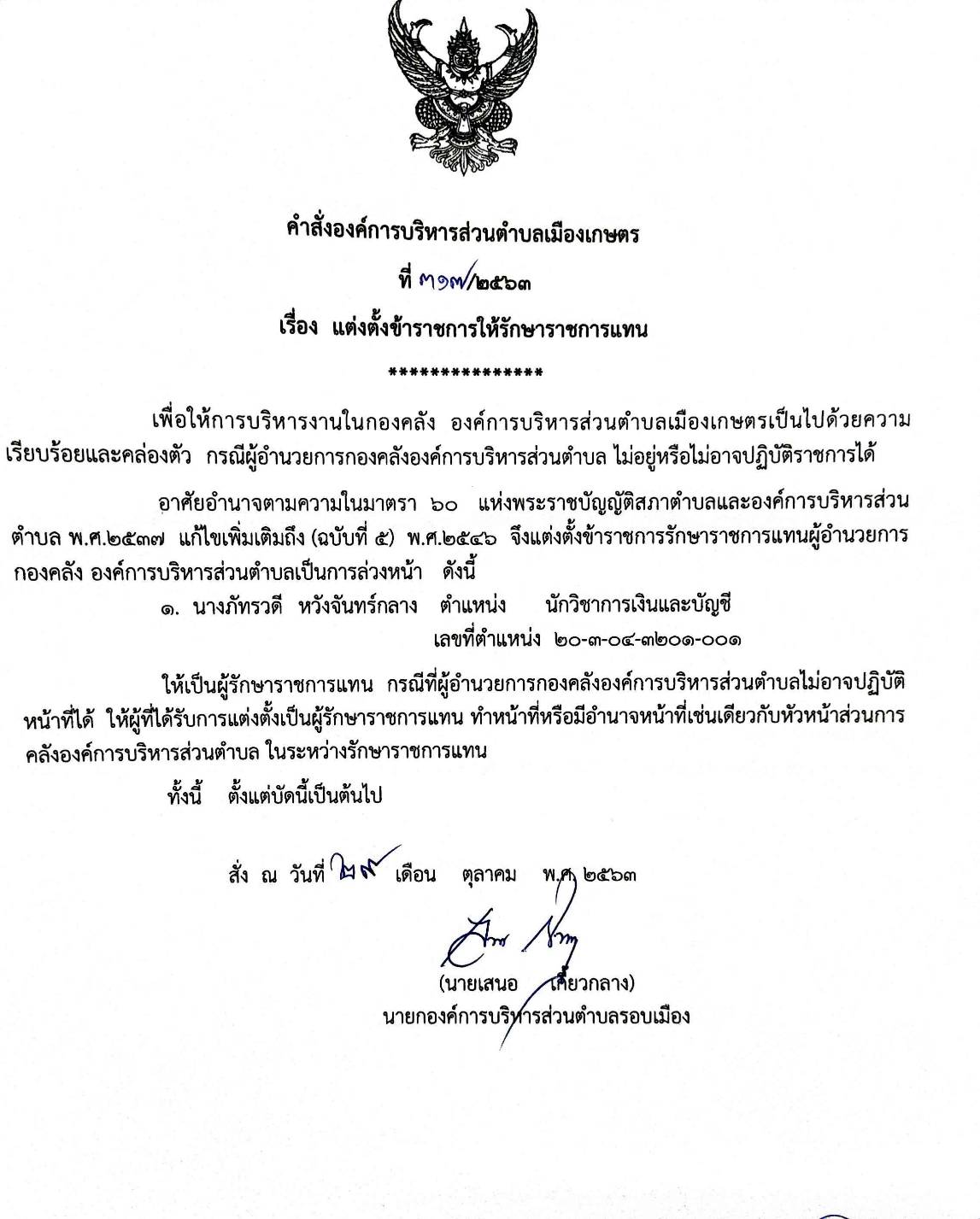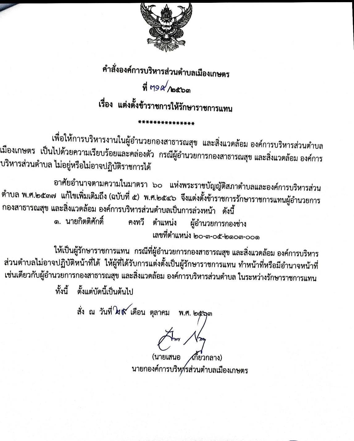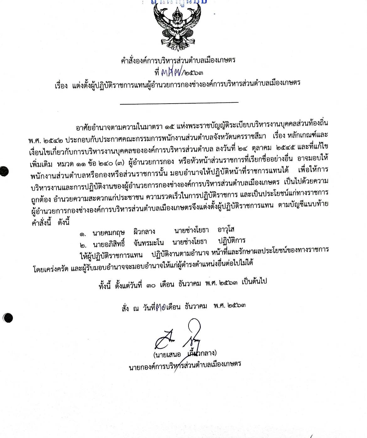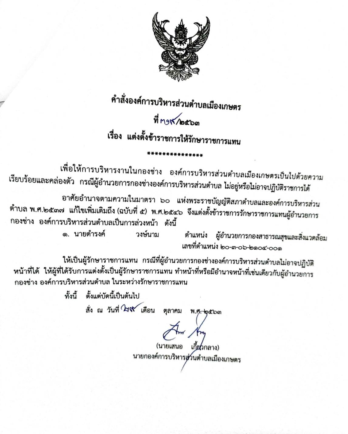 ประชาสัมพันธ์การมอบอำนาจปฏิบัติราชการและรักษาราชการแทนภายใน อบต.เมืองเกษตร