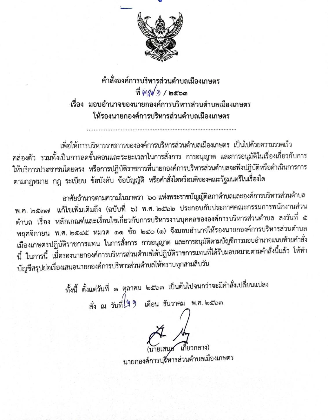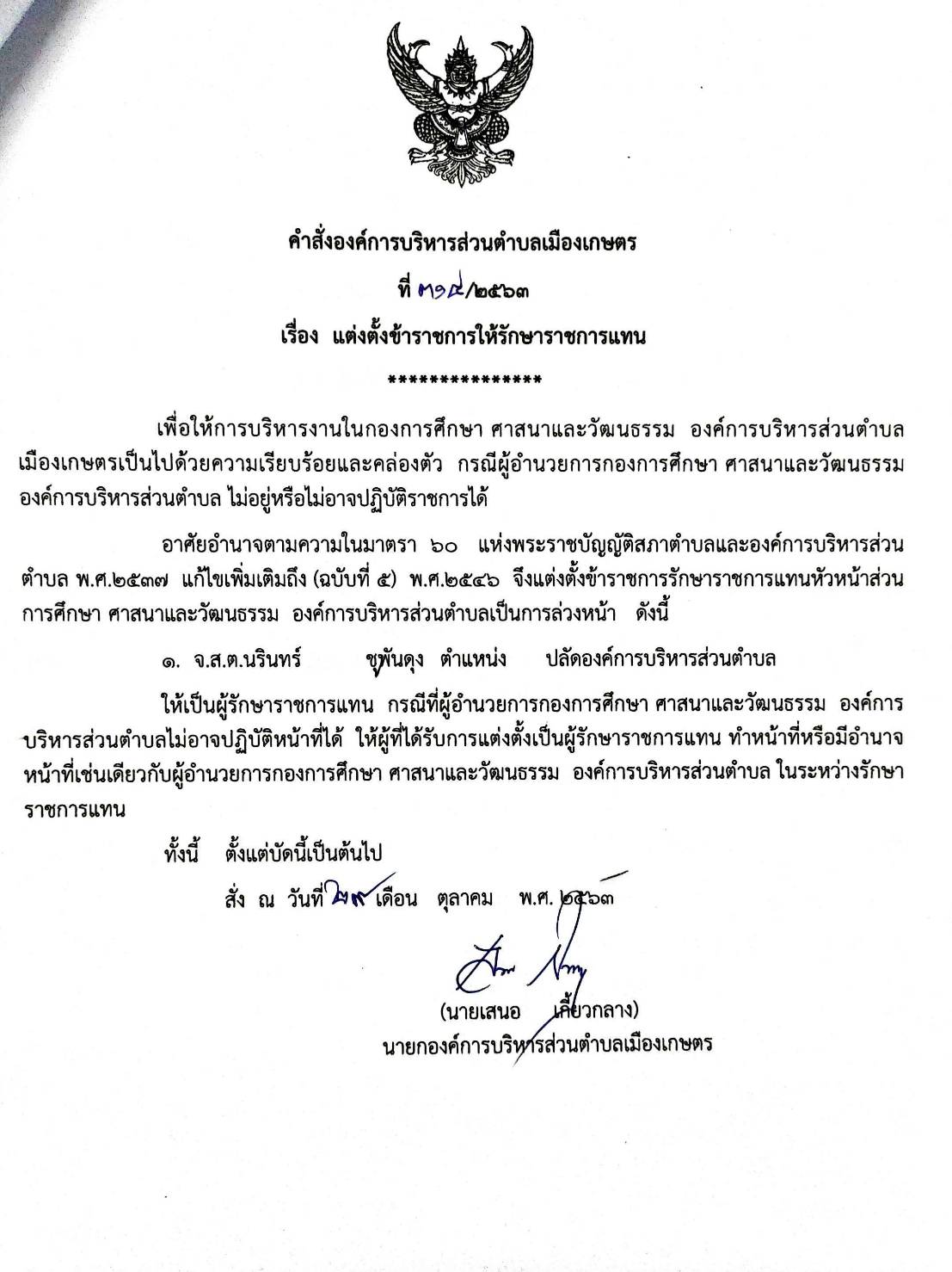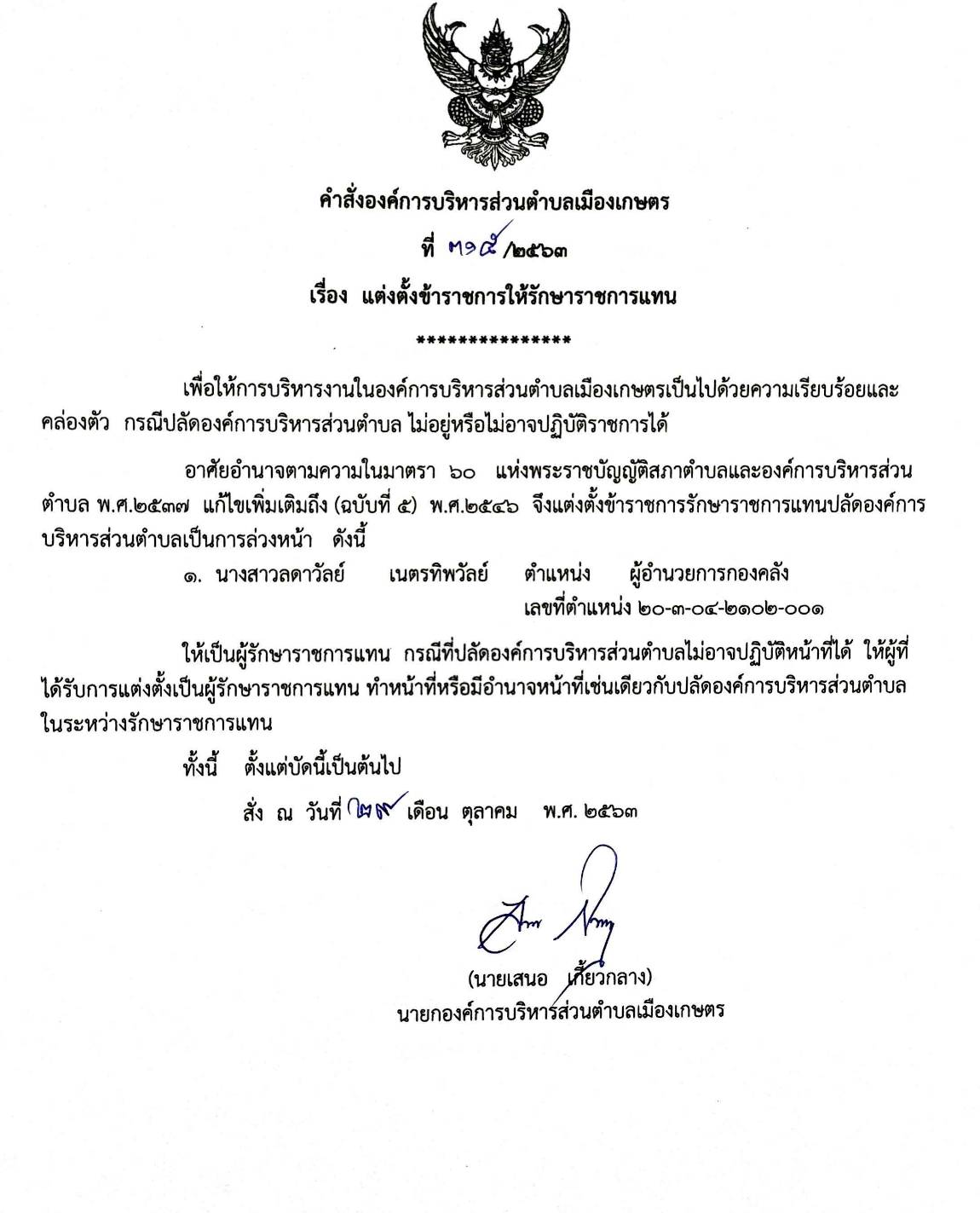 ประชาสัมพันธ์การมอบอำนาจปฏิบัติราชการและรักษาราชการแทนภายใน อบต.เมืองเกษตร